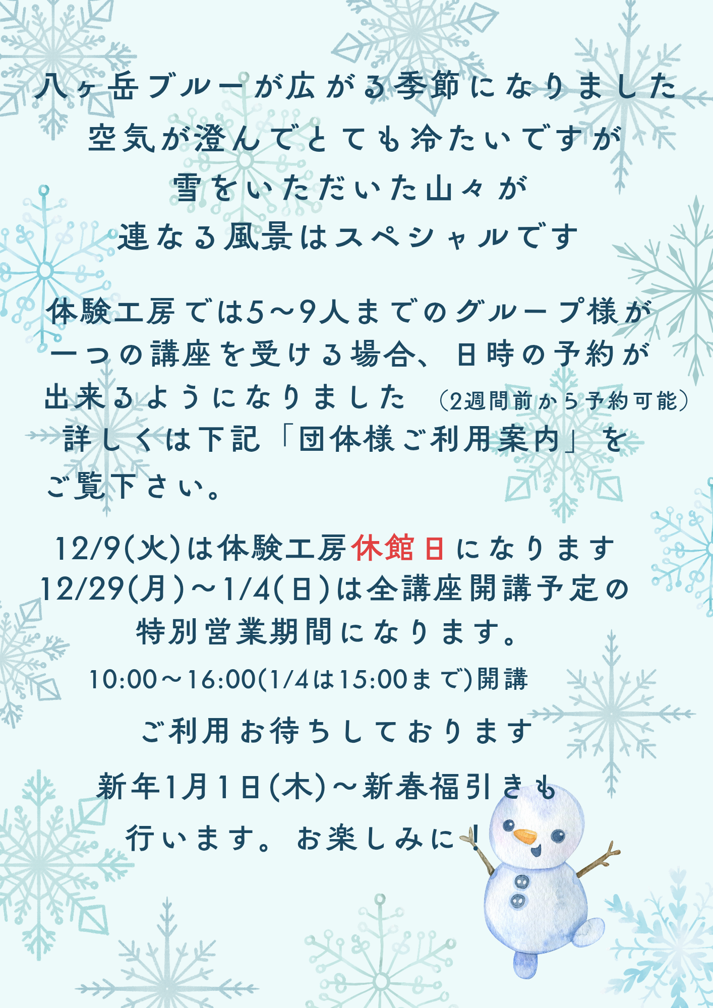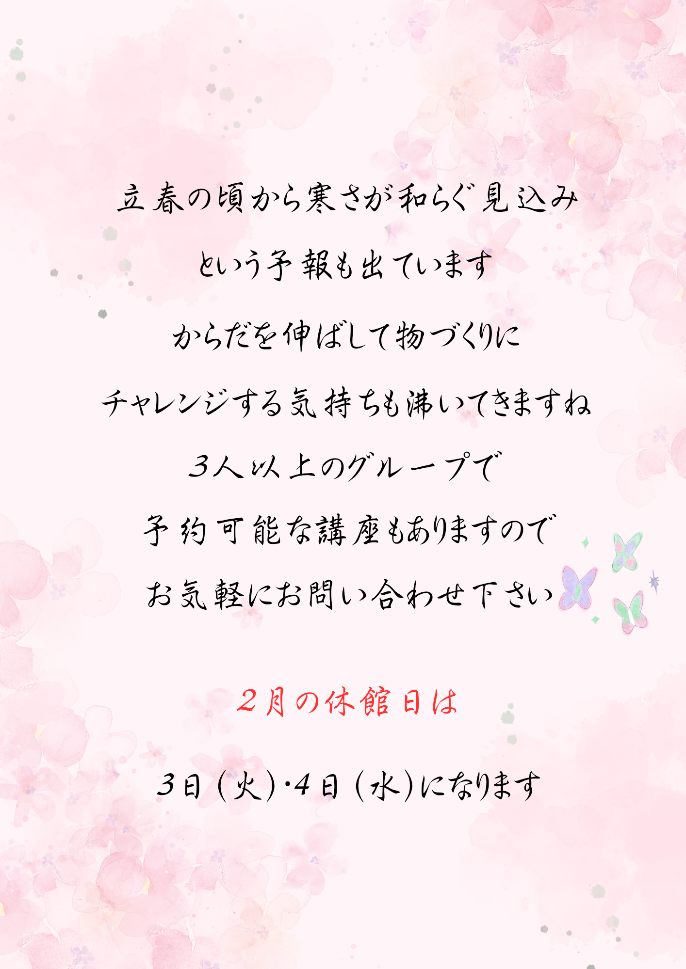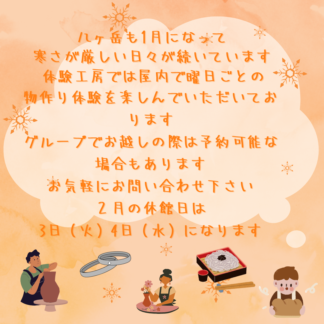 小淵沢スパティオ体験工房 ●体験受付時間 4月~12月 10:00~16:00 1月~3月 10:00~15:00 ●営業時間 9:00~17:00 ご予約・お問い合わせ先 〒408-0044 山梨県北杜市小淵沢町 2968-1 スパティオ小淵沢 体験工房 TEL 0551-36-6121 FAX 0551-36-6122