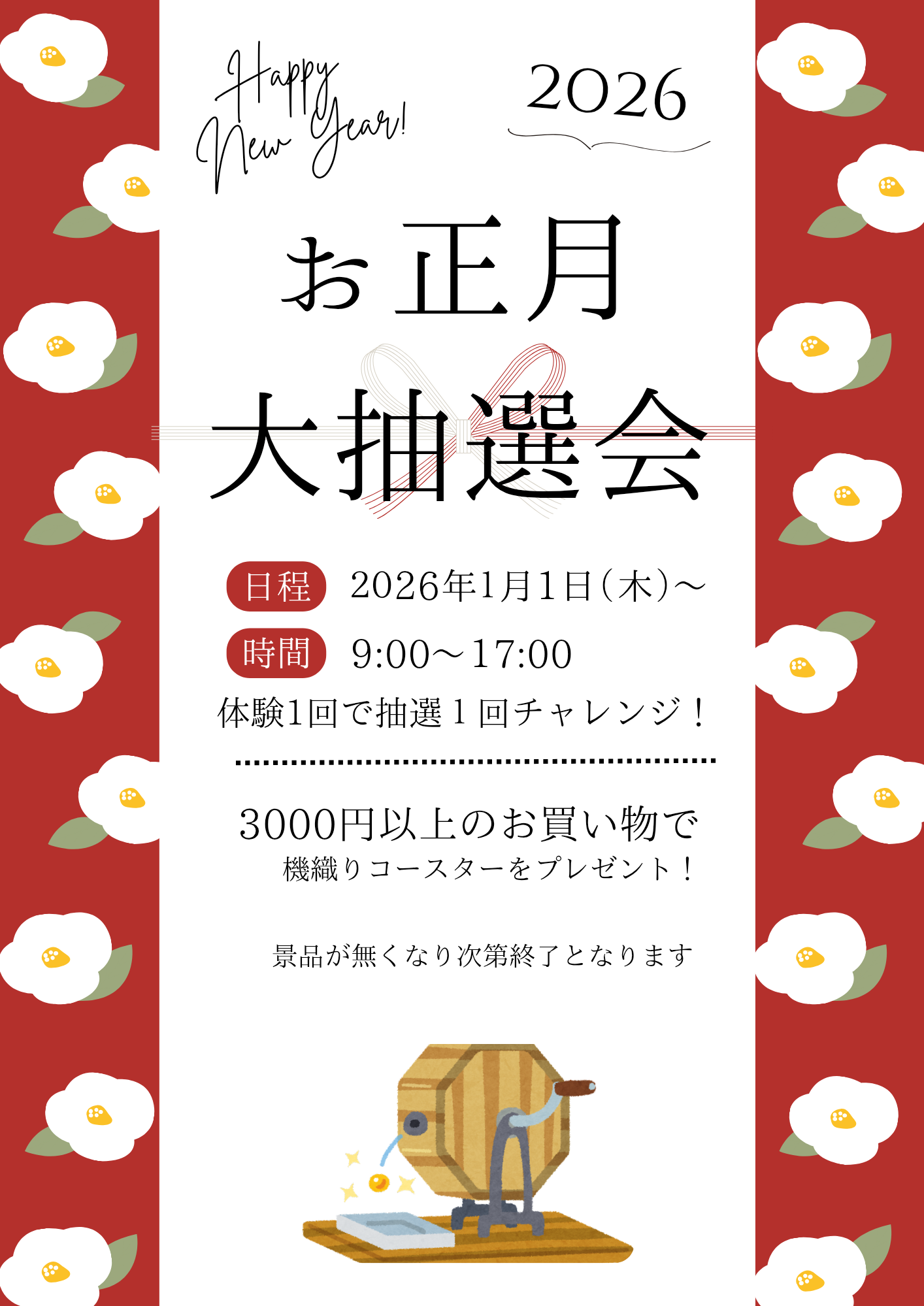 営業時間:午前9時~午後5時 体験時間:午前10時~最終受付4~12月午後4時、1~3月午後3時